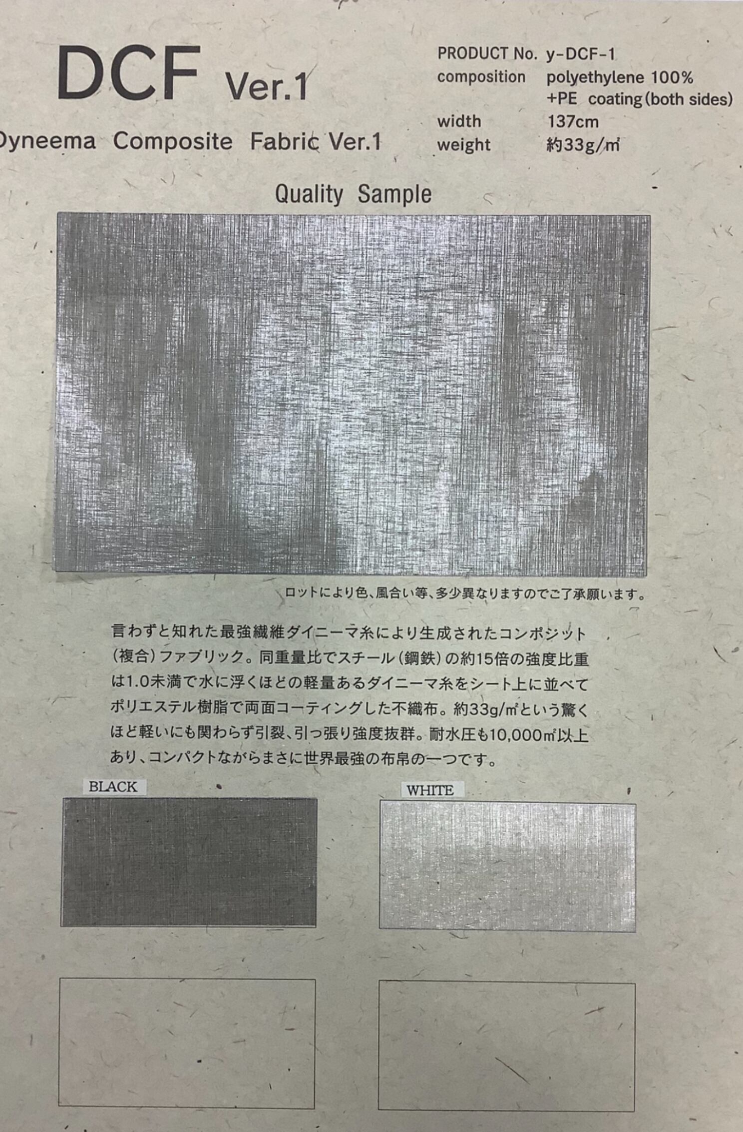 言わずと知れた超高強度ポリエチレン繊維により生成されたコンポジット(複合)ファブリック。同重量比でスチール(鋼鉄)の約15倍の強度、比重は1.0未満で水に浮くほどの軽量である超高強度ポリエチレン繊維をシート状に並べてポリエステル樹脂で両面コーティングした不織布。約33g/m2という驚くほど軽いにも関わらず引裂き、引っ張り強度抜群。耐水圧も10,000m以上あり、コンパクトながらまさに世界最強の布帛の一つです。